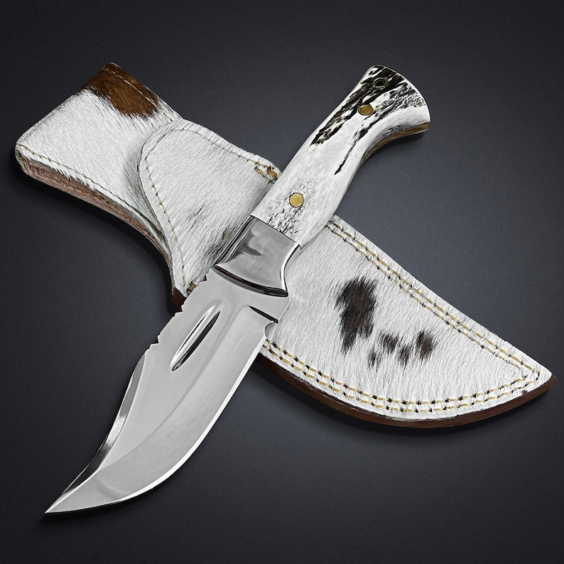 CUSTOM HANDMADE STAINLESS STEEL CLIP POINT HUNTING KNIFE WITH VEGETABLE TANNED COW HIDE LEATHER SHEATH: